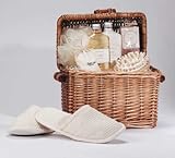 34187 An evening of relaxation beckons from this picnic basket! Bath gel, soap, lotion, and bath salts in a delicious "Pure Pleasure Honey Vanilla" scent are combined with a wood massage tool and a sponge. 11 7/8" x 7 5/8" x 11 3/8" high.