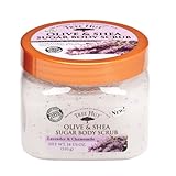 Delight your senses as you smooth your skin with this rich, exfoliating olive and shea sugar body scrub. The whole sugar grains provide a gentle yet deep exfoliation, the olive oil and shea help preserve your skin's natural moisture and the vitamin c keeps your skin looking healthy. Certified organic shea butter, natural moisturizer, hydrates dry skin and promotes skin elasticity. Certified organic olive oil, rich in nutrients, antioxidants and vitamins. Includes anti-inflammatory, moisturizing and regenerating properties.