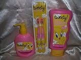 This set contains everything you need to set up your Tweety Bird bathroom!(1) 12 fl oz bottle of Tweety Bird 2 in 1 Conditioning Shampoo(1) 7.5 fl oz bottle of Tweety Bird Hand Soap(1) 2-Pack of Tweety bird tooth brushes